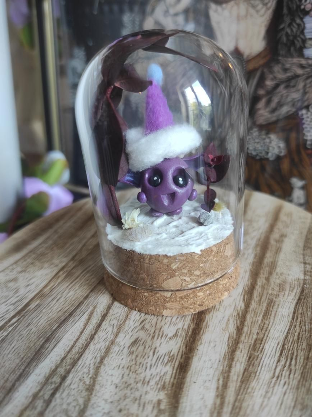 Présentée sous une cloche en verre d’environ 8,35 x 5,5 cm avec base en liège, chaque création repose sur un décor en matériaux synthétiques, stabilisés ou séchés, ne nécessitant aucun entretien.