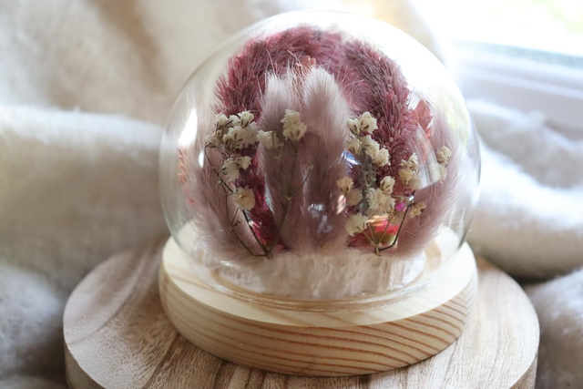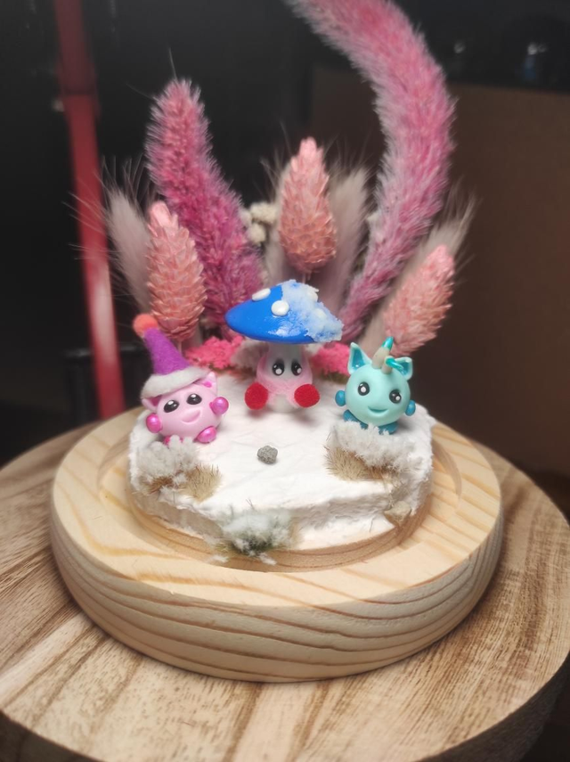Présentés sous une cloche en verre de 10 x 12 cm avec socle en bois, ils reposent sur un décor en polystyrène peint et verni, complété d’éléments synthétiques, stabilisés ou séchés, ne nécessitant aucun entretien.