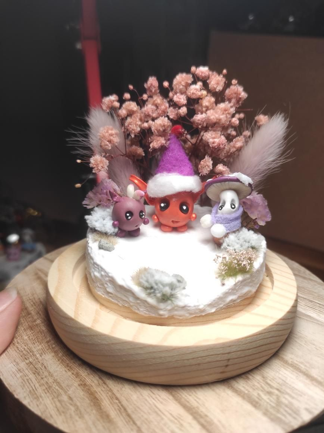Présentés sous une cloche en verre de 10 x 12 cm avec socle en bois, ils reposent sur un décor en polystyrène peint et verni, complété d’éléments synthétiques, stabilisés ou séchés, ne nécessitant aucun entretien.