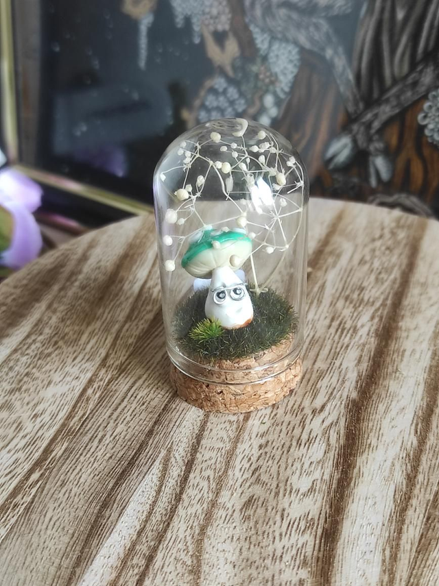 Présentée sous une cloche en verre de 3 x 5 cm avec base en liège, chaque création repose sur un décor en matériaux synthétiques, stabilisés ou séchés, ne nécessitant aucun entretien.