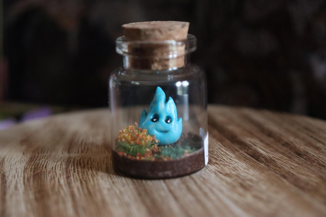 Présentée dans un bocal en verre de 3x5 cm , cette création artisanale repose sur un décor en matériaux synthétiques, stabilisés ou séchés, ne nécessitant aucun entretien.