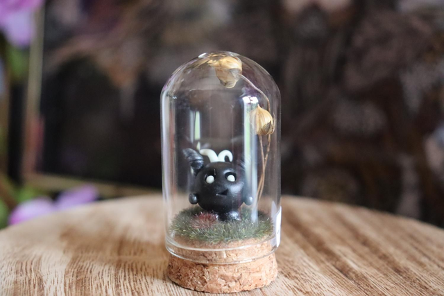 Présentée sous une cloche en verre de 3 x 5 cm avec base en liège, cette création artisanale repose sur un décor en matériaux synthétiques, stabilisés ou séchés, ne nécessitant aucun entretien.