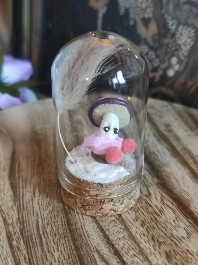 Présentée sous une cloche en verre d’environ 3 x 5 cm avec base en liège, cette création artisanale repose sur un décor en matériaux synthétiques, stabilisés ou séchés, ne nécessitant aucun entretien.