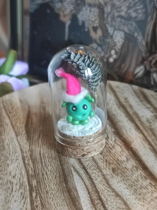 Présentée sous une cloche en verre d’environ 3 x 5 cm avec base en liège, cette création artisanale repose sur un décor en matériaux synthétiques, stabilisés ou séchés, ne nécessitant aucun entretien.
