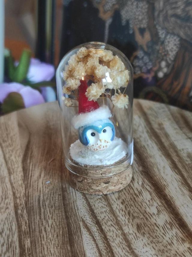 Présentée sous une cloche en verre d’environ 3 x 5 cm avec base en liège, cette création artisanale repose sur un décor en matériaux synthétiques, stabilisés ou séchés, ne nécessitant aucun entretien.