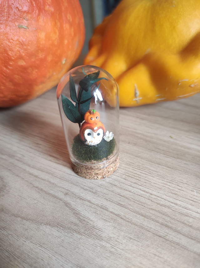 Présentée sous une cloche en verre de 3x5 cm avec base en liège, cette création artisanale est accompagnée d’un décor en matériaux synthétiques, stabilisés ou séchés, ne nécessitant aucun entretien.