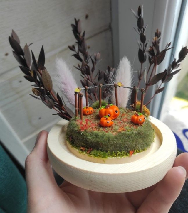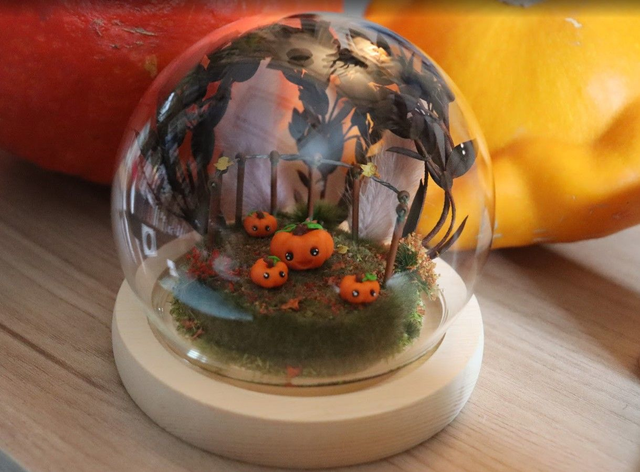 Présentés sous une cloche en verre de 10 x 12 cm avec socle en bois, ils reposent sur un décor en polystyrène peint et verni, agrémenté d’éléments synthétiques, stabilisés ou séchés.
