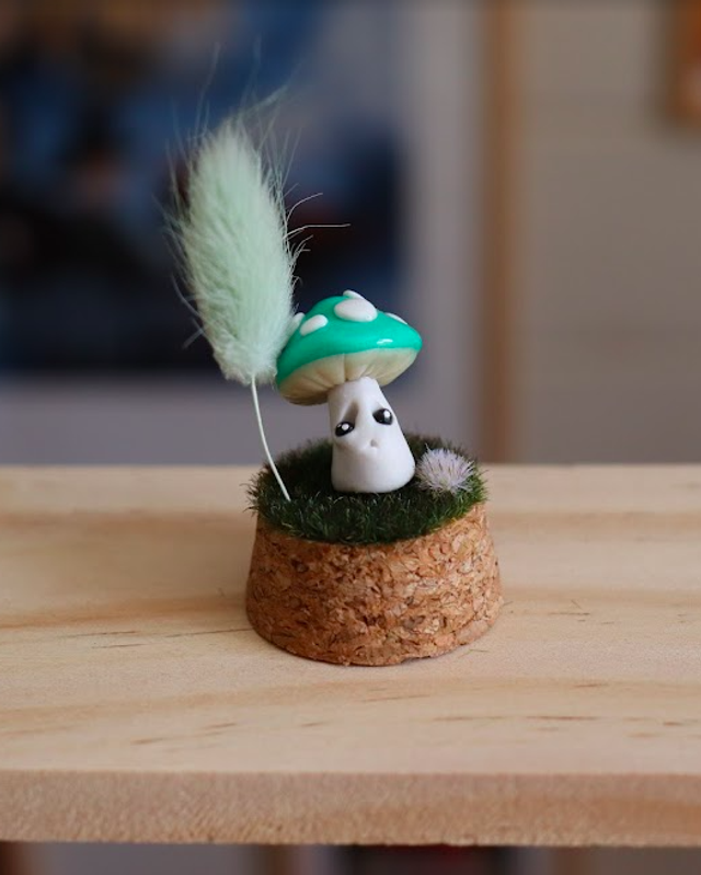 Ces êtres fantastiques, inspirés des champignons, sont entièrement modelés à la main en pâte polymère artisanale.