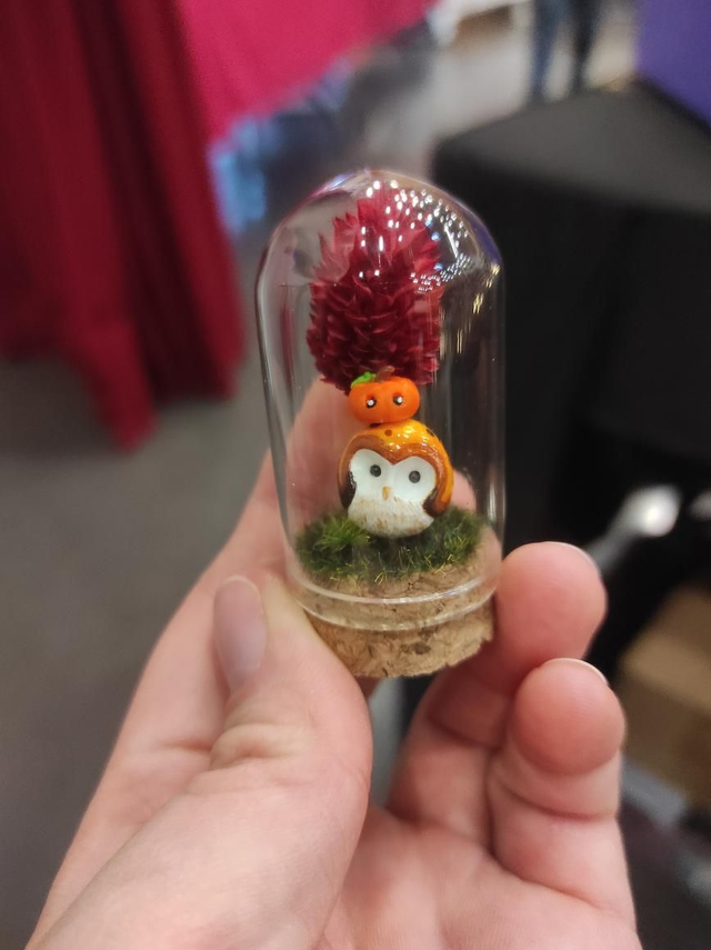 Présentée sous une cloche en verre de 3x5 cm avec base en liège, cette création artisanale est accompagnée d’un décor en matériaux synthétiques, stabilisés ou séchés, ne nécessitant aucun entretien.